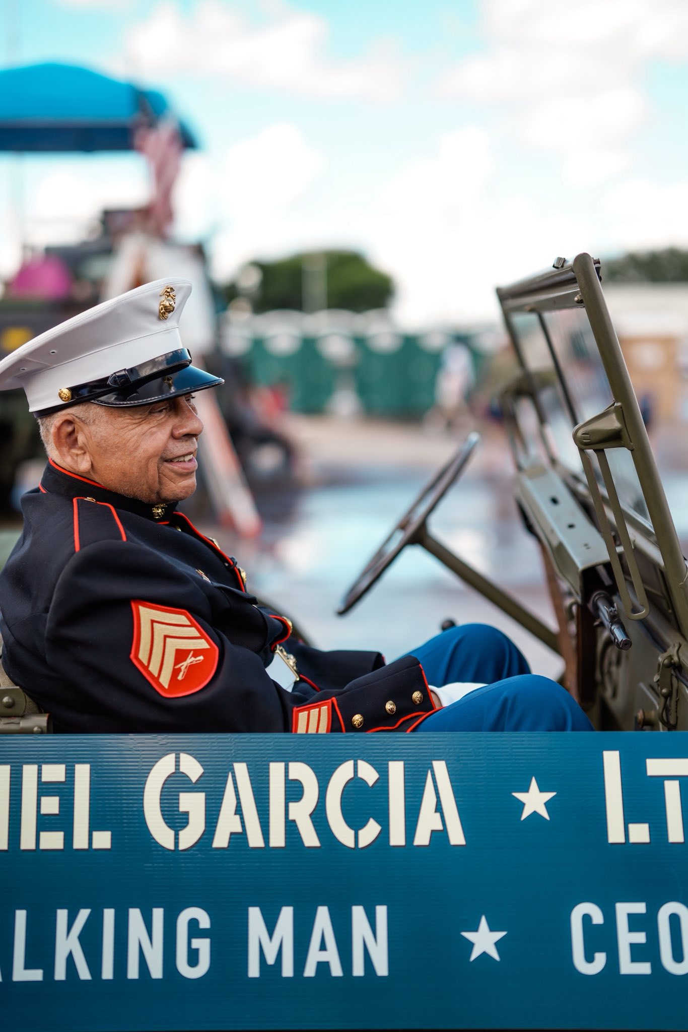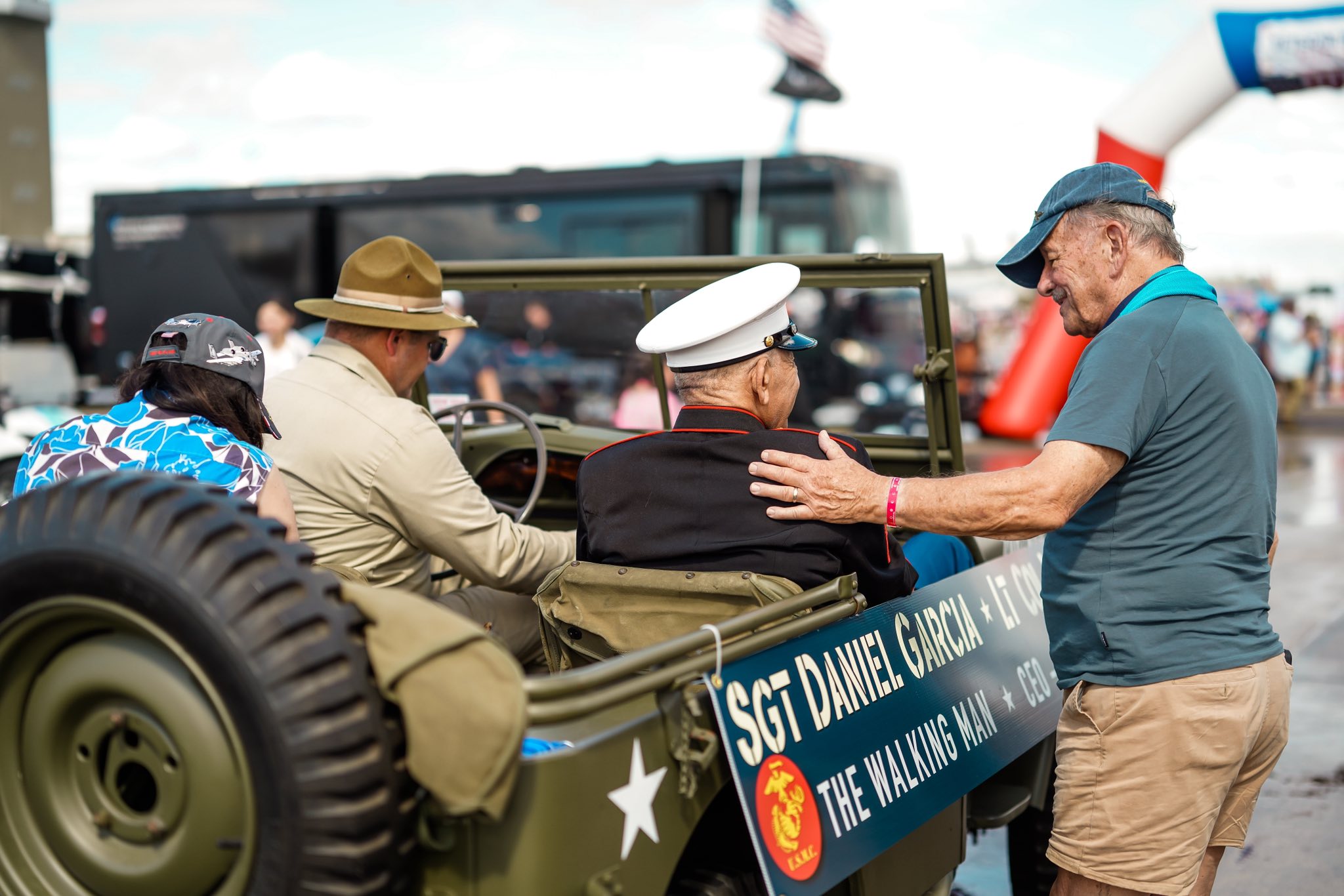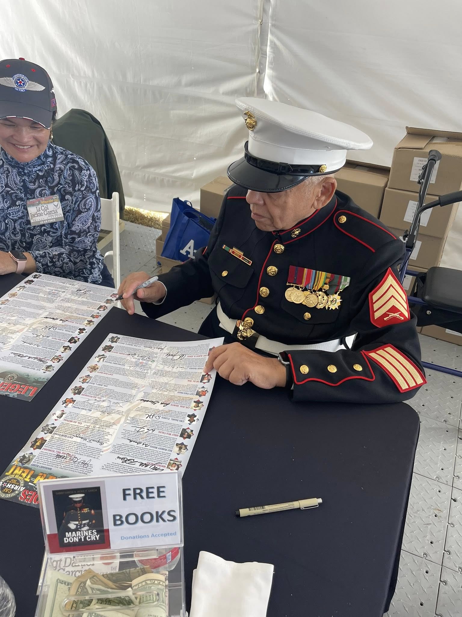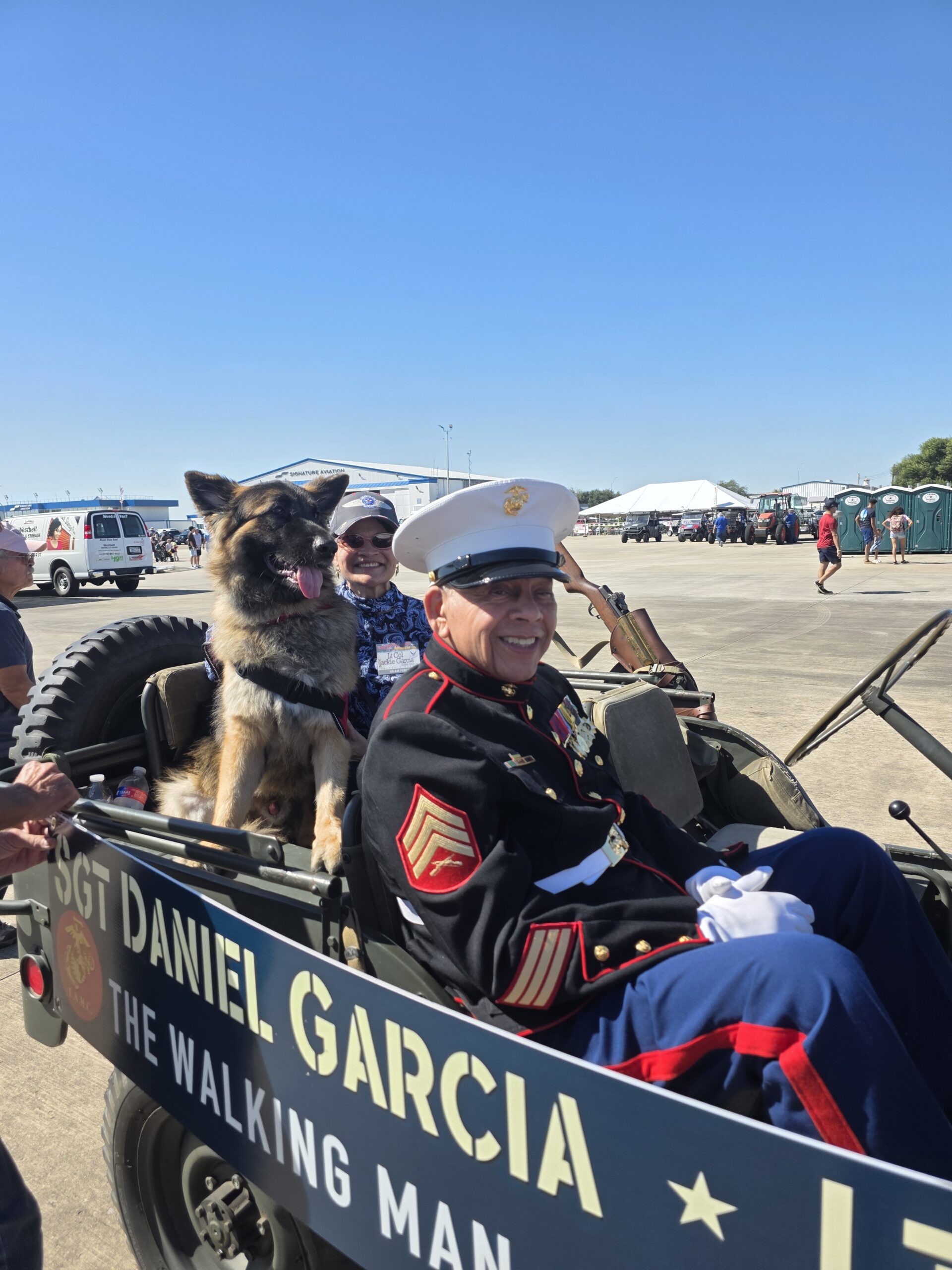 The trio of Sgt Danny Garcia Walking Man, Lt Col Jackie C. Garcia, and SSgt Asher Garcia made a first-time appearance at Wings Over Houston, Oct 17-19, 2025. We are privileged to be invited as special guests in the Heroes and Legends Autograph Tent. It was humbling and such an honor to be amongst such personalities of air, space, ground, & sea from WWII, Vietnam, and Afghanistan. Also included was the original Tinker Bell and the former pitcher of the All-American Girls Professional Baseball League (made famous by the movie “A League of Their Own), Maybelle Blair.