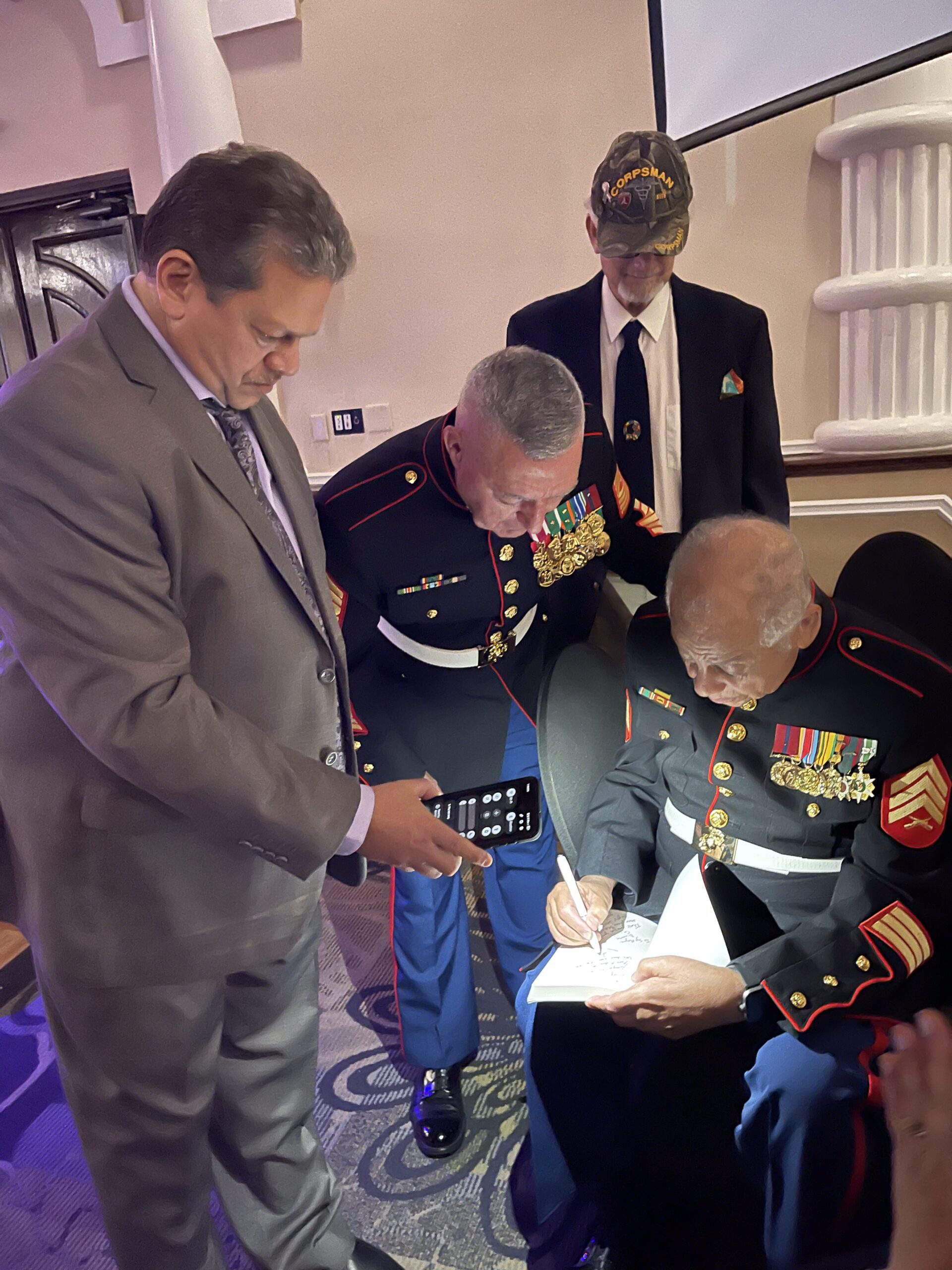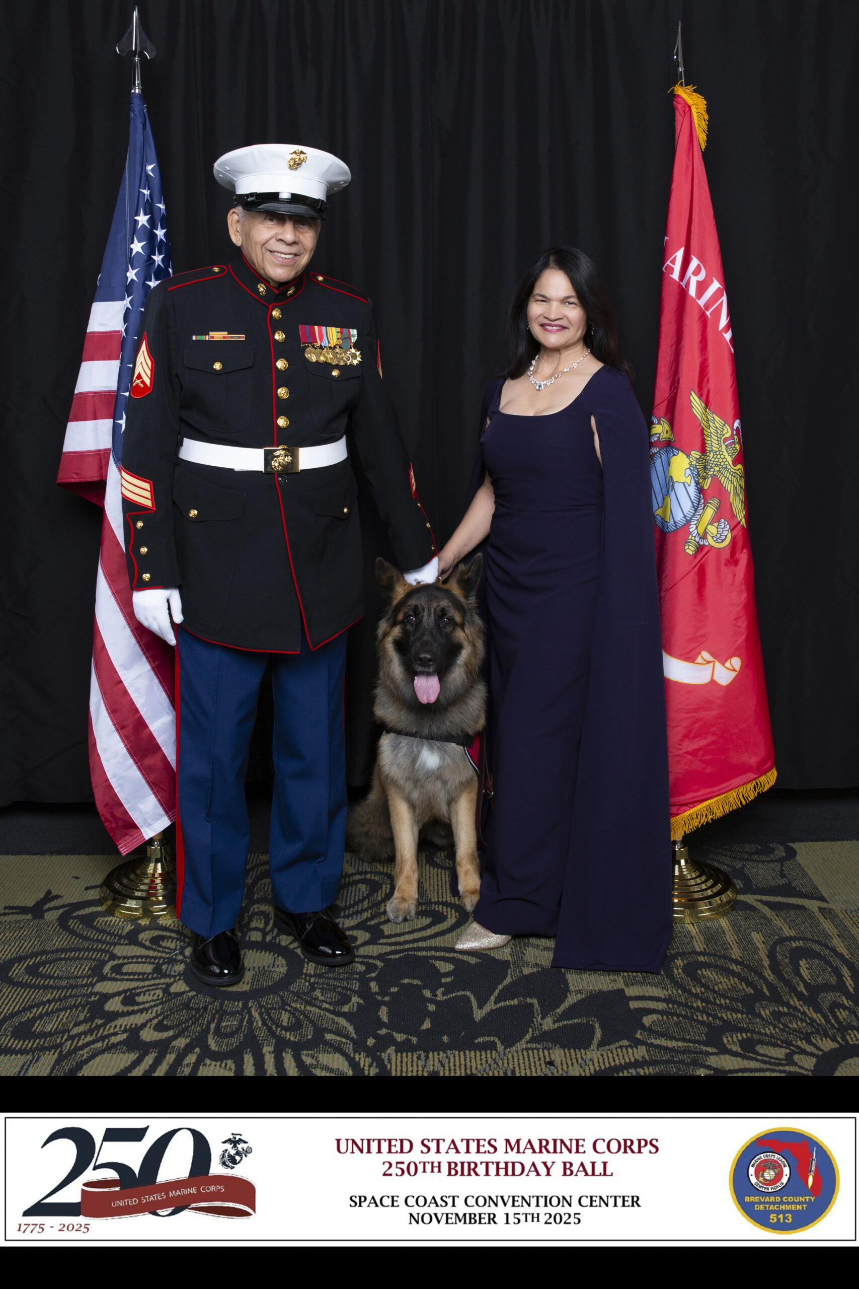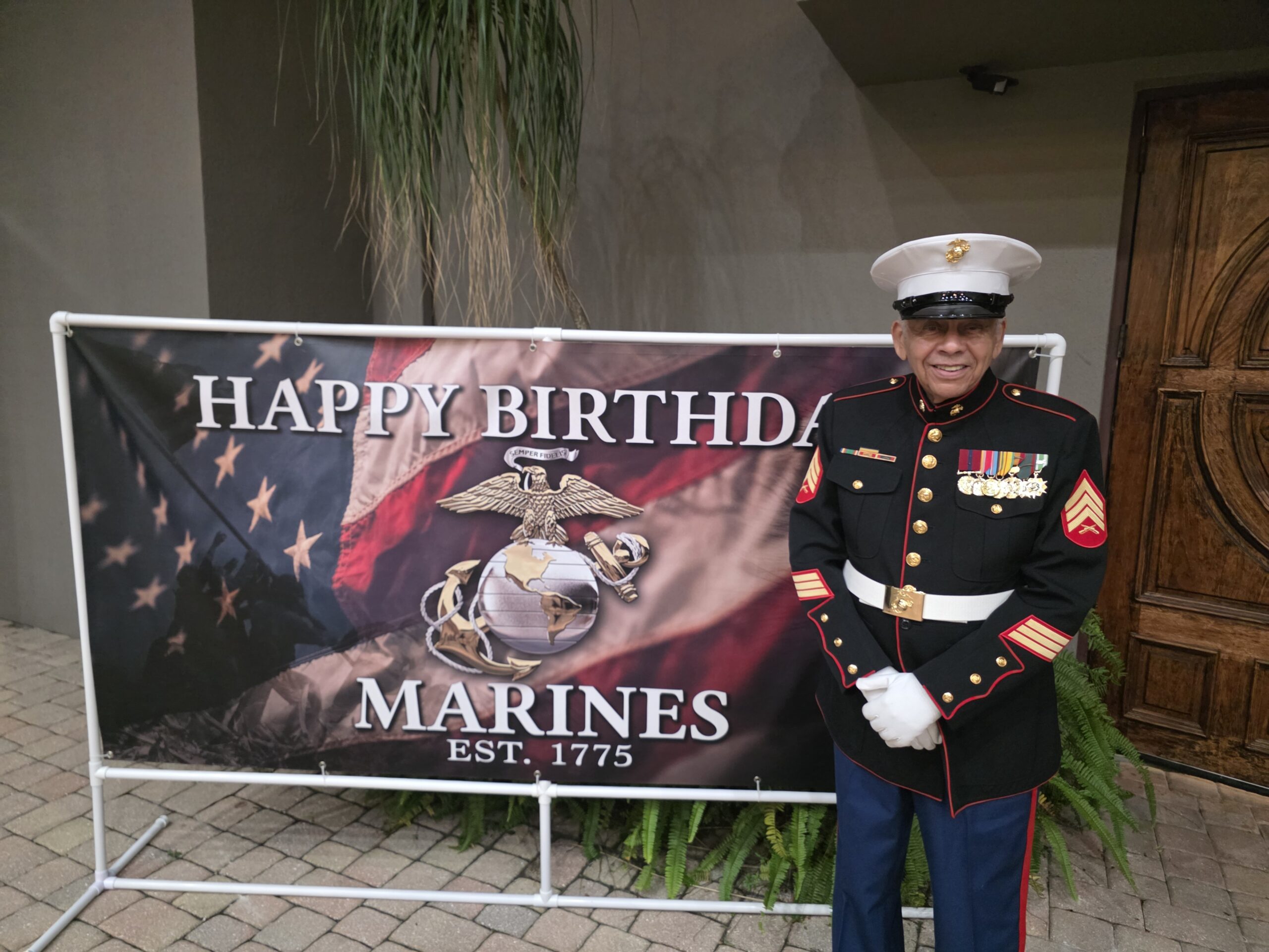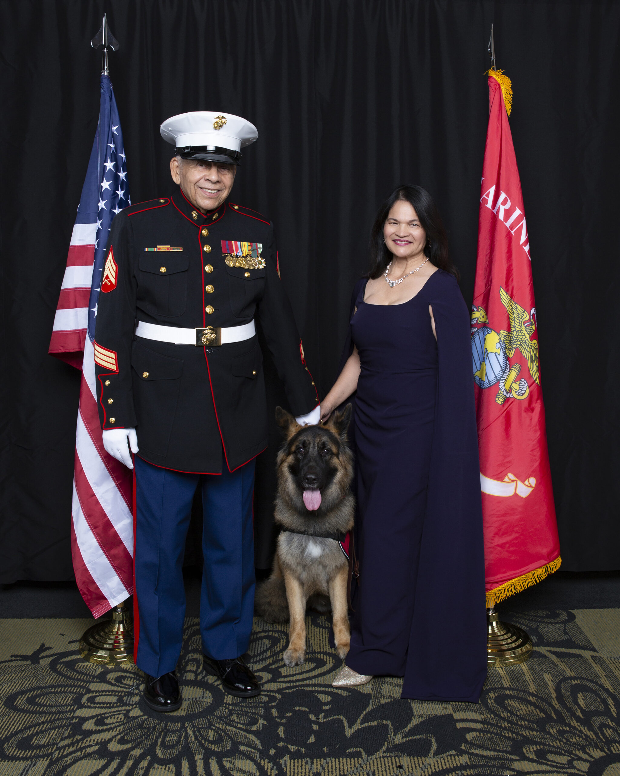 I was blessed to stand beside my husband, Danny Garcia Walking Man, a proud US Vietnam Marine veteran. His sons, Danny Garcia Jr. and Sean Garcia, and Danny’s faithful service dog, SSgt Asher joined the celebration. Seeing three generations together in one room, honoring the Corps and all who have worn the uniform, was deeply moving and humbling.